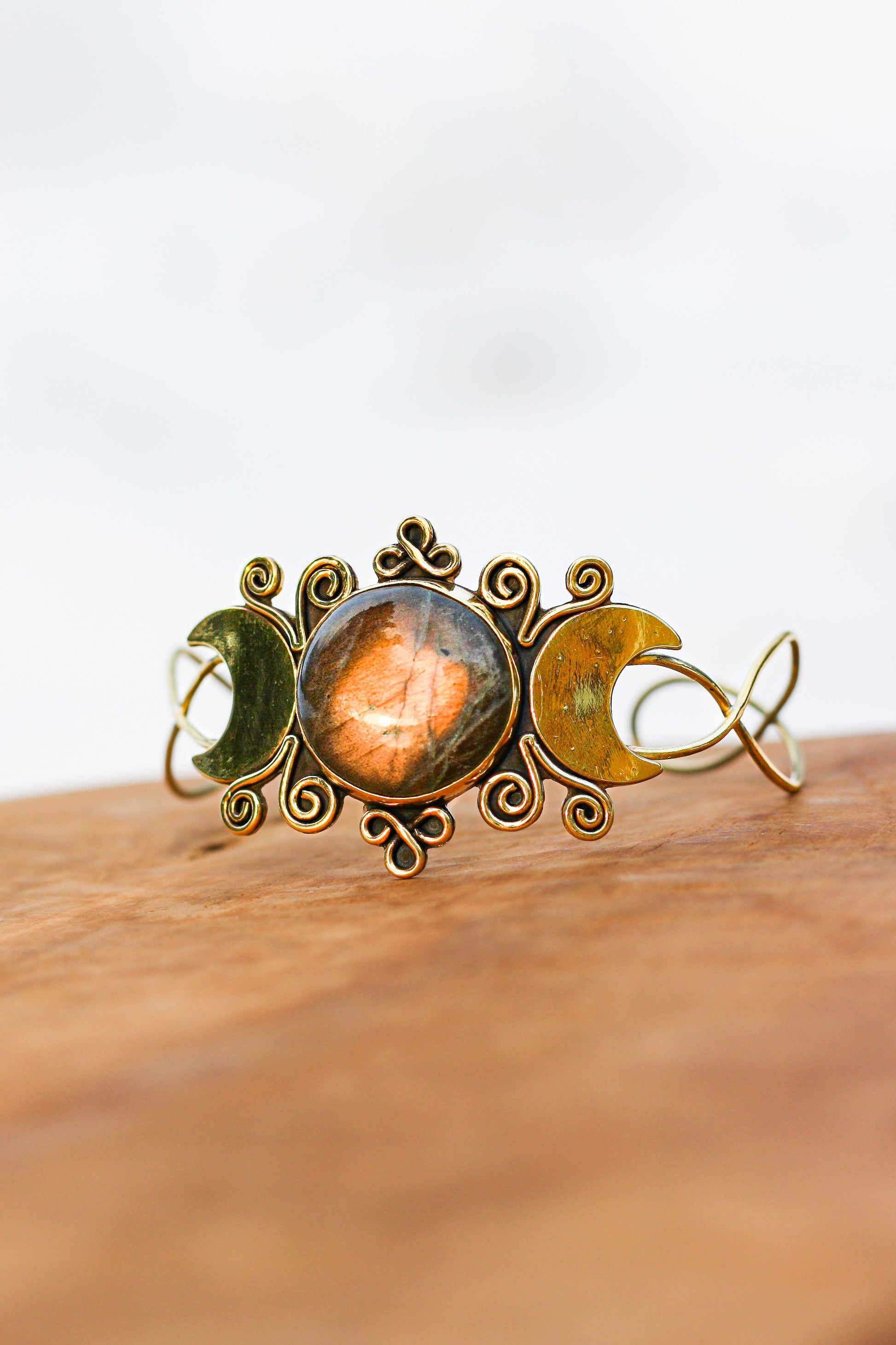 🌙 Bracelet de la grande prêtresse en forme de pleine lune. Orné des sa labradorite ronde, des croissants lunaires avec leurs circonvolutions, laissez-vous emporter dans la magie lunaire de l’enchanteresse. Entièrement réalisée à la main en laiton; conception, découpe, brasure, serti clos, polissage.