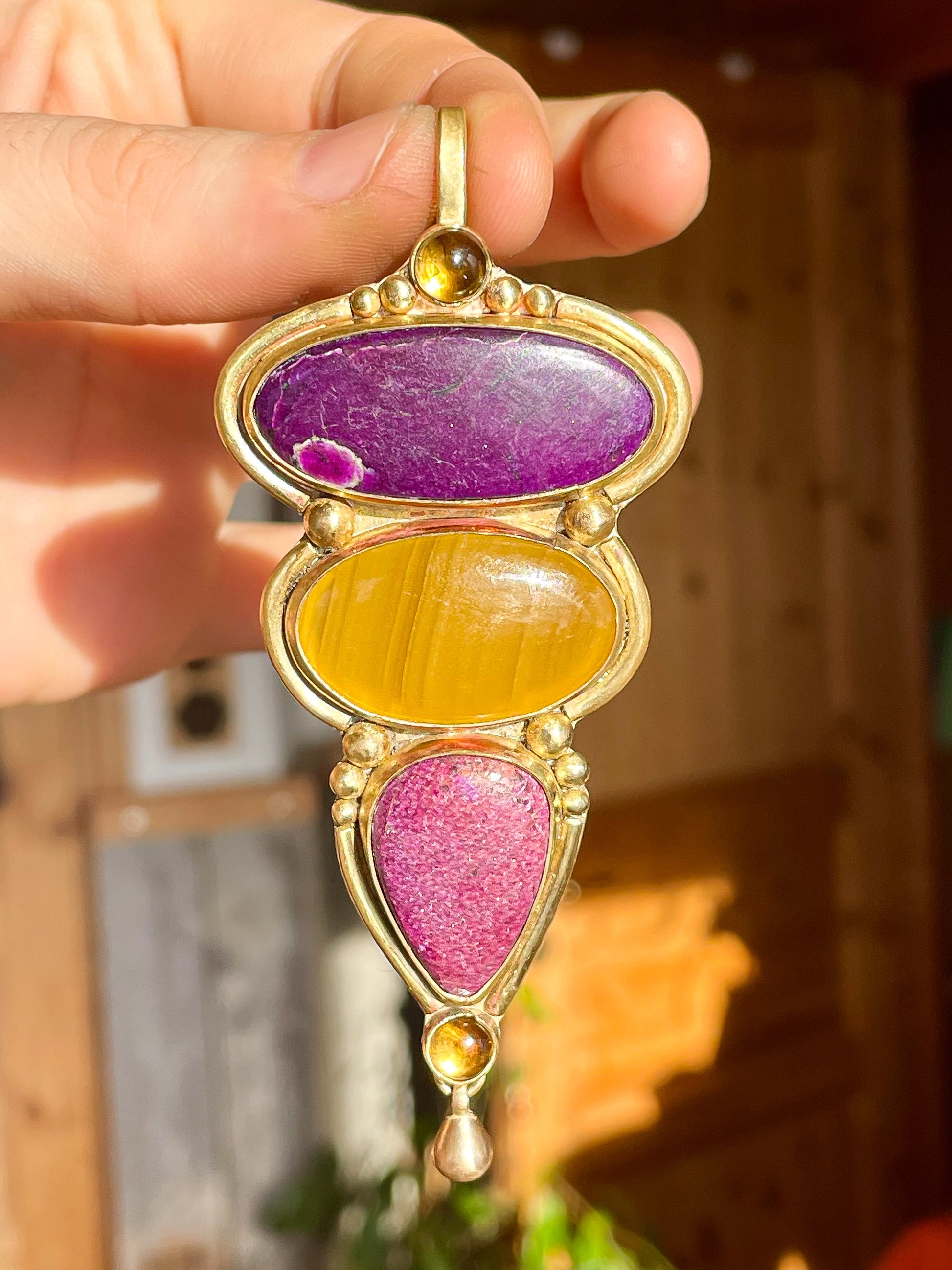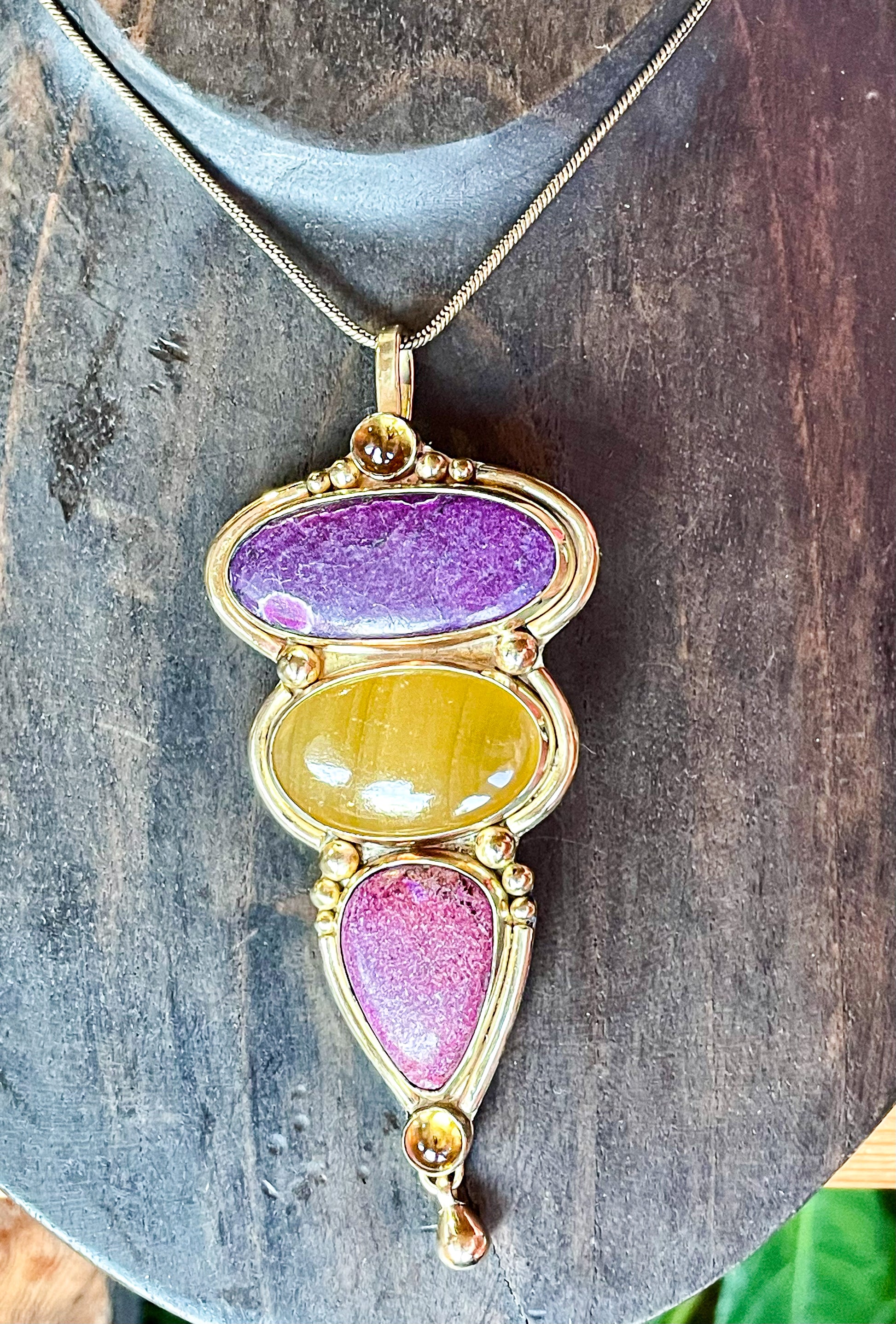 💜💛 pendentif 5 pierres, citrines, stichtite, agate jaune en laiton avec sa chaîne.