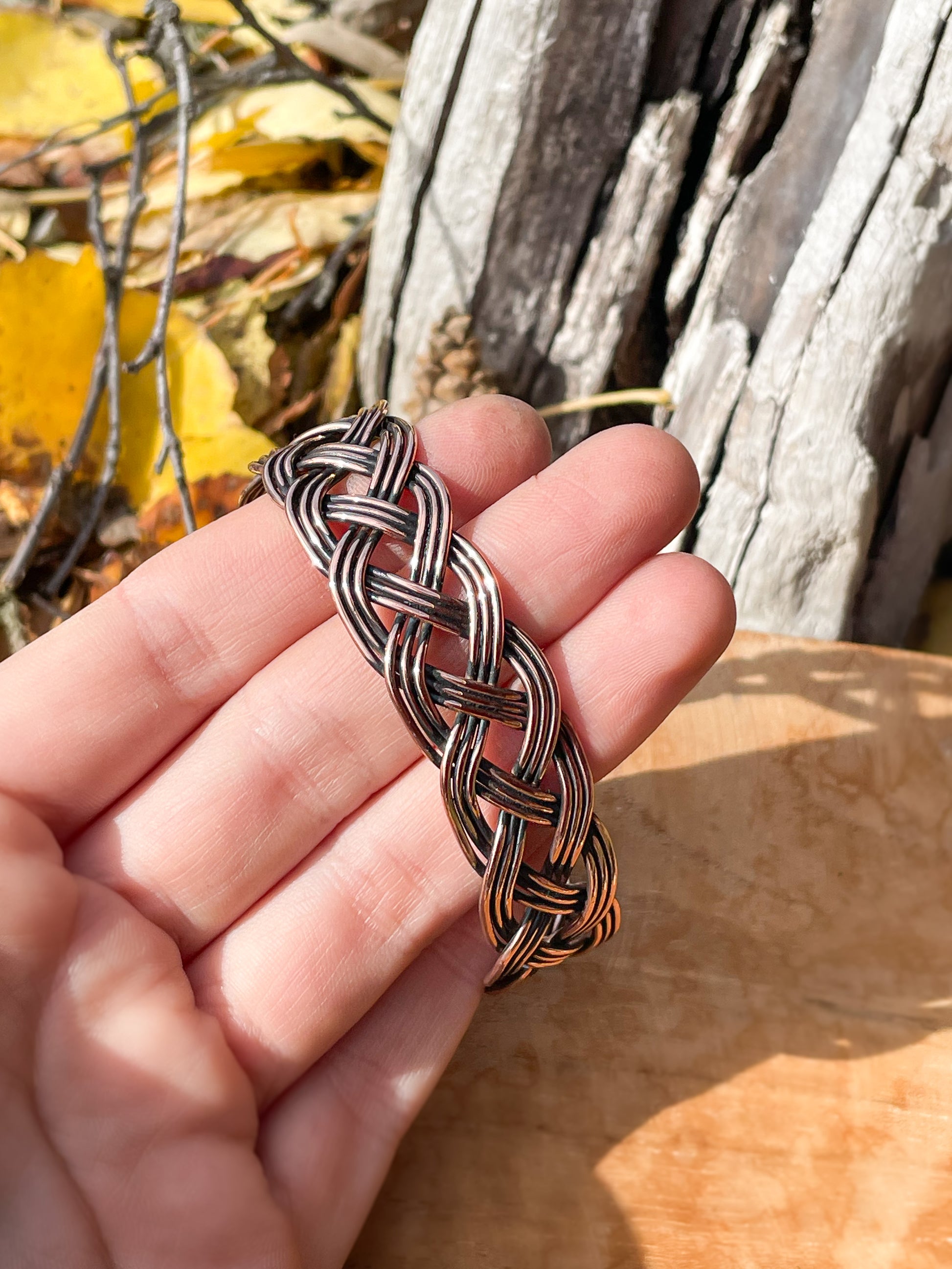 Bracelet de 2 cm large, tresse à 12 fils de cuivre soudés.